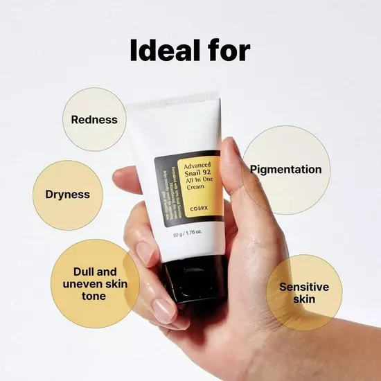 Αυτό που ξεχωρίζει αυτό την Advanced Snail 92 All in one Cream είναι η μοναδική, πλούσια υφή κρέμας που μοιάζει με τζελ. Η ελαφριά υφή του δεν αφήνει λιπαρά υπολείμματα, καθώς είναι κατάλληλη για λιπαρούς τύπους δέρματος. Ταυτόχρονα, μπορούμε να την συνδυάσουμε με άλλα προϊόντα εάν έχουμε πιο ξηρό δέρμα. Επίσης, ταιριάζει εξαιρετικά σε όλους τους τύπους δέρματος. Είτε θέλουμε να καταπολεμήσουμε τη θαμπή όψη, την αφυδάτωση, τα σπυράκια ή τη γήρανση του δέρματος, αυτή η Advanced Snail 92 All in one Creamείναι πραγματικά μια ολοκληρωμένη λύση που γεμίζει το δέρμα με υγρασία και του παρέχει λάμψη.